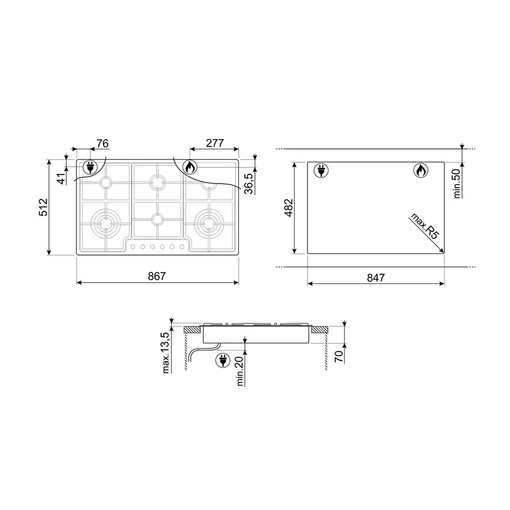 - سطح غاز سميج مدمج 90 سم مع قواعد من الحديد.